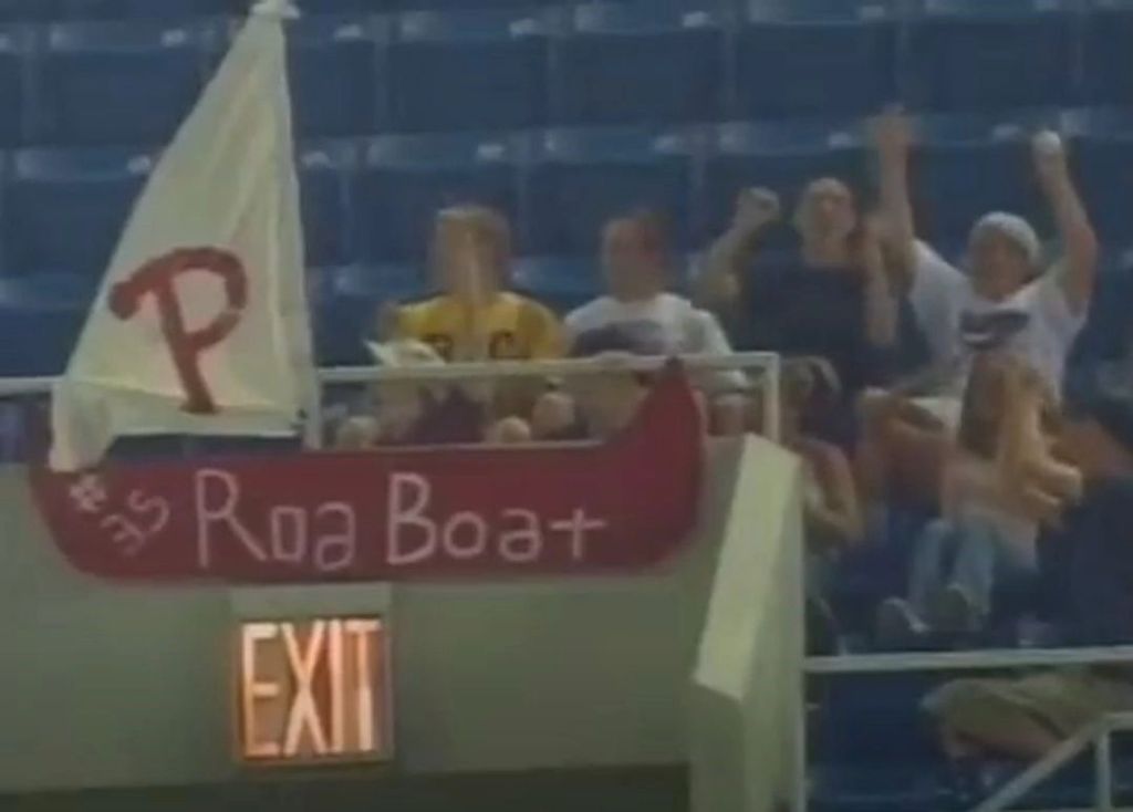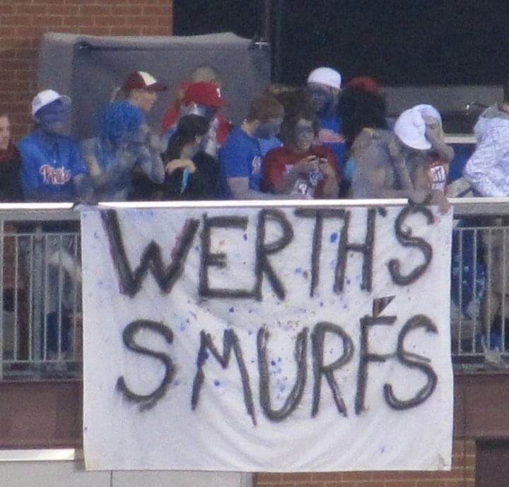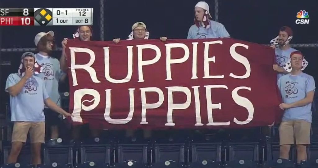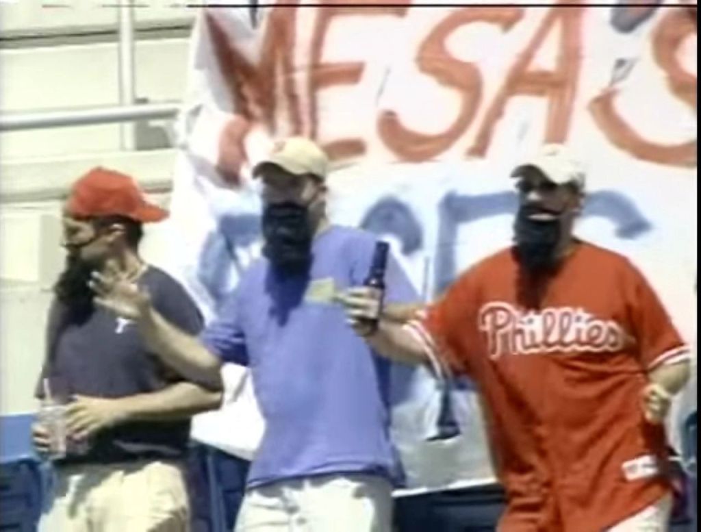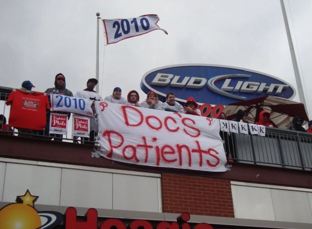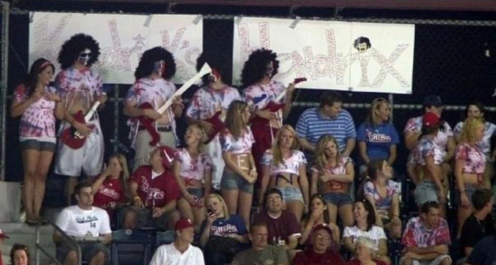Philadelphia sports fans are notorious for their level-headedness and logical sports opinions. Just look at the example above from 1907. Over the past 130 years, at least, Phillies fans have formed groups with one another to voice their cheers and jeers in unison. Some groups are player specific while others are general team fan groups. The “Golden Age” of Phillies fan groups is arguably the late-90s/early-00s. The teams weren’t that great and cheap seats were plentiful at the cavernous Vet. What better way to show your support than painting a few clever words onto a bedsheet? Bonus points for relevant attire.