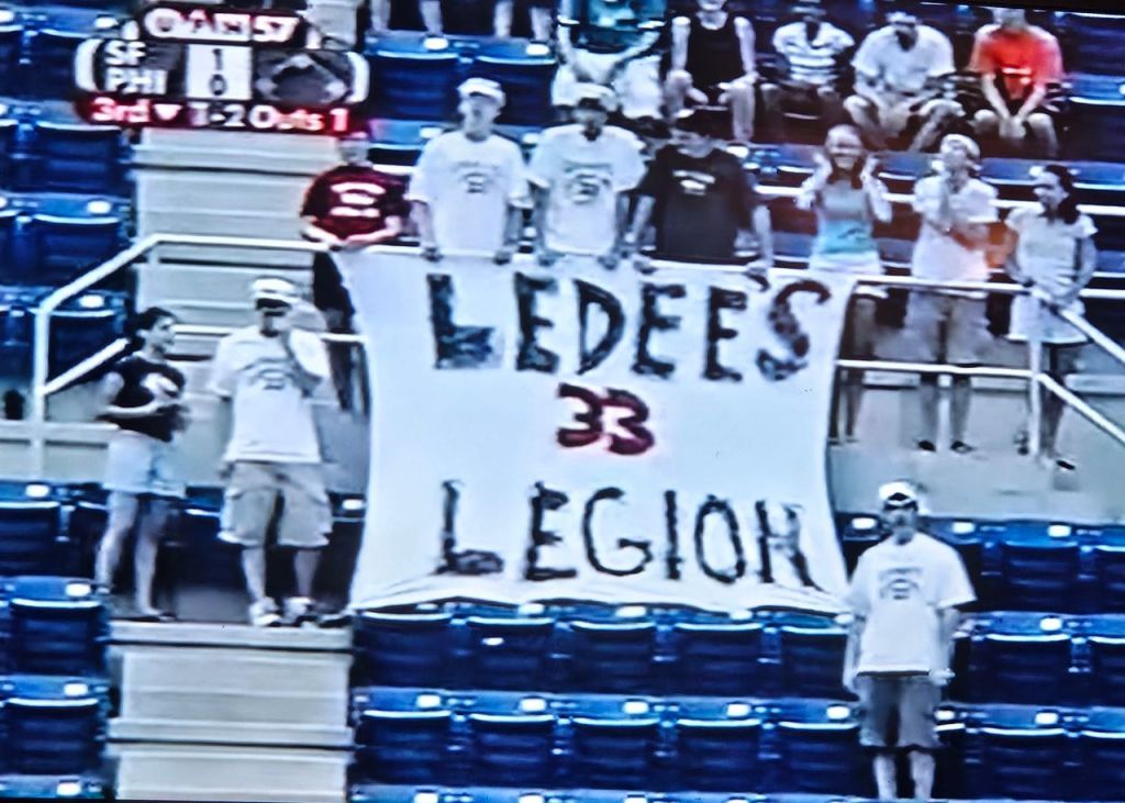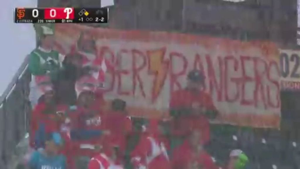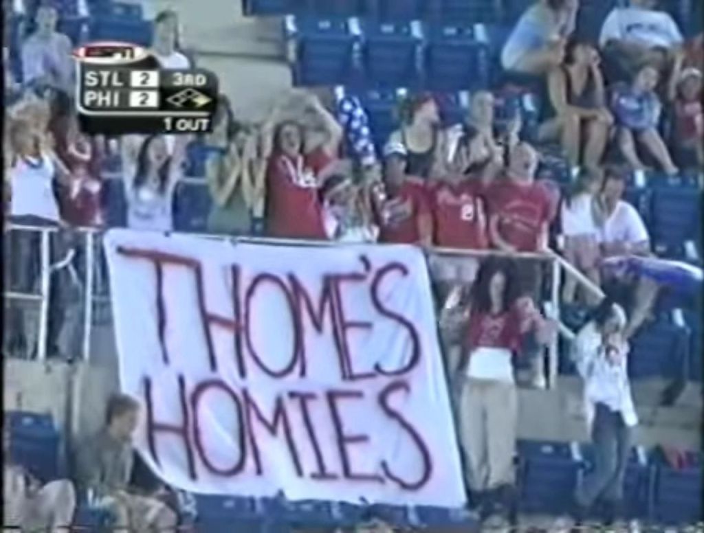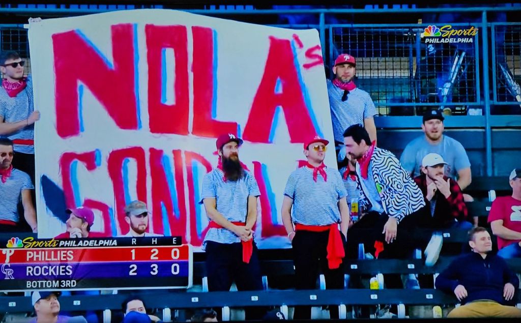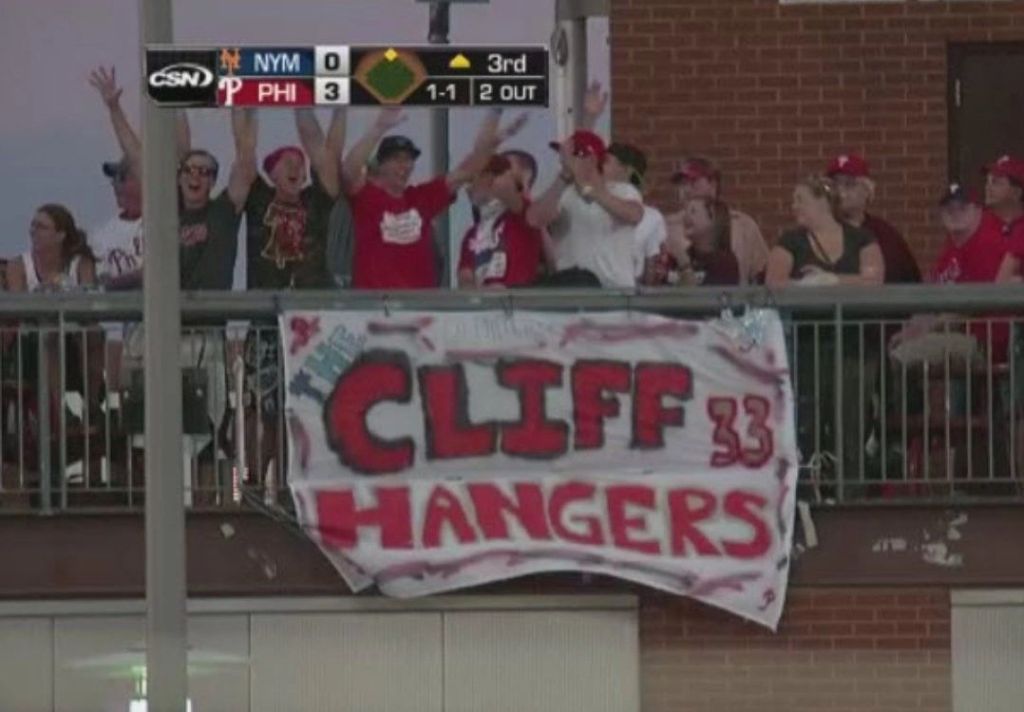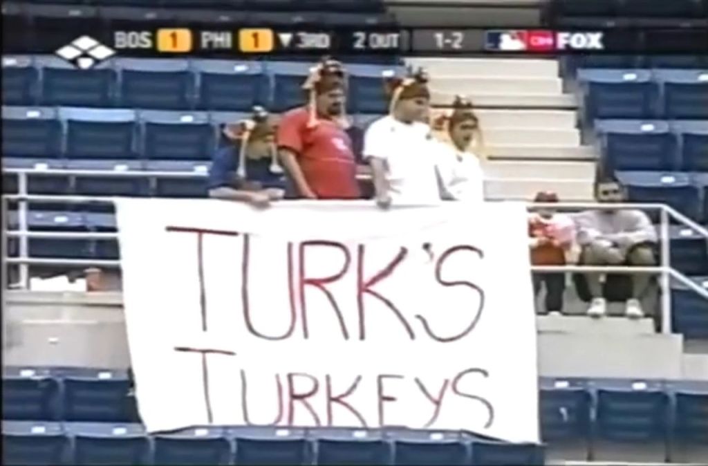 Philadelphia sports fans are notorious for their level-headedness and logical sports opinions. Just look at the example above from 1907. Over the past 130 years, at least, Phillies fans have formed groups with one another to voice their cheers and jeers in unison. Some groups are player specific while others are general team fan groups. The “Golden Age” of Phillies fan groups is arguably the late-90s/early-00s. The teams weren’t that great and cheap seats were plentiful at the cavernous Vet. What better way to show your support than painting a few clever words onto a bedsheet? Bonus points for relevant attire.