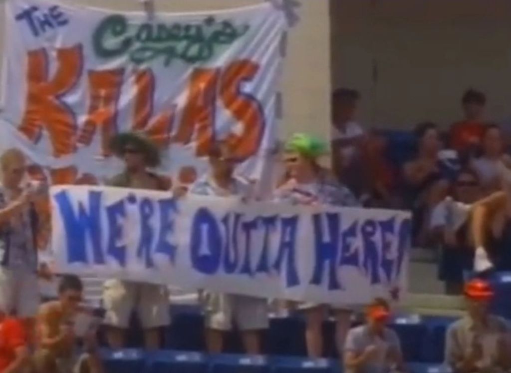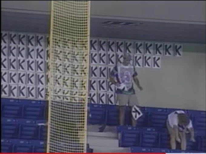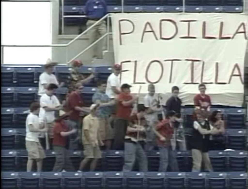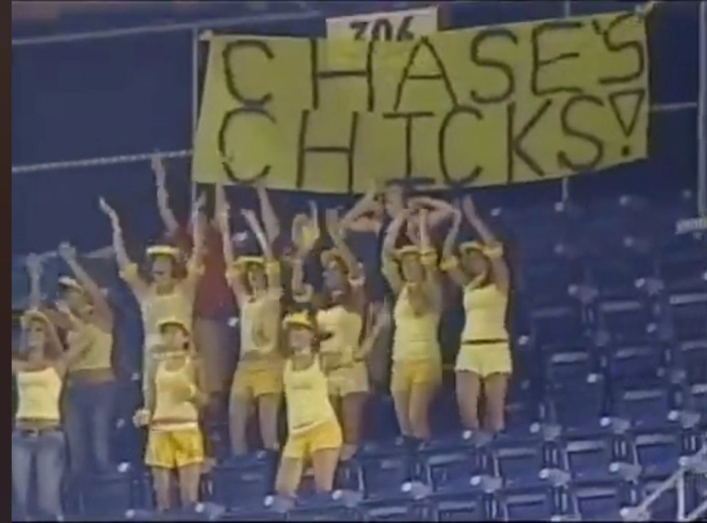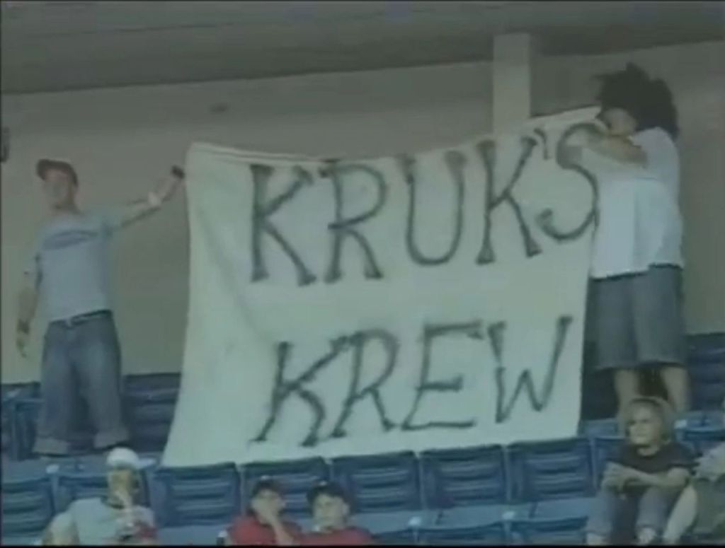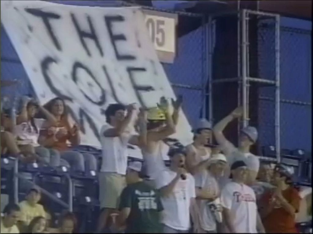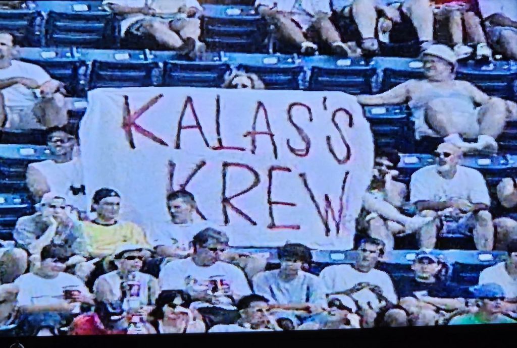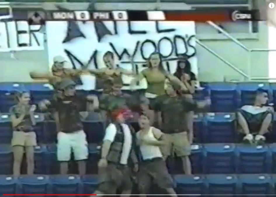 I don’t have any confirmed background but from what I’ve gathered, this early popular Millwood fan group showed up to the Vet dressed in camouflage and fatigues and at some point(s), a member would rip his shirt off Hulk Hogan style, exposing a painted or taped “K” on his chest. The group also incorporated a “Millometer”, where they tracked Millwood’s strikeouts by hanging “K’s” in the area. A lot of their antics can be seen on this YouTube video.