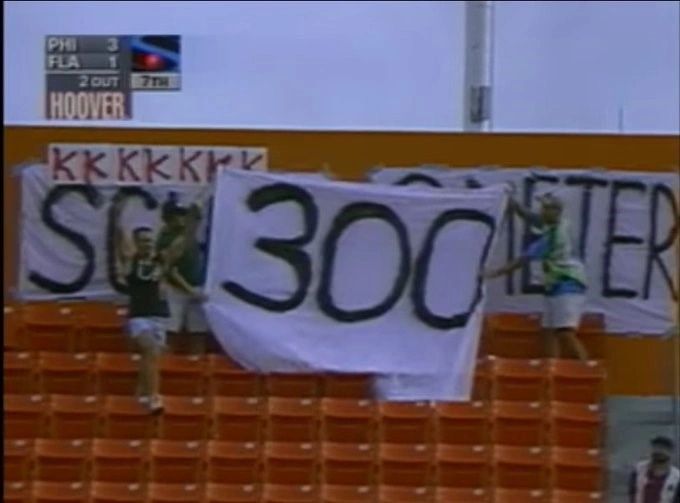 The second picture above shows the Schill-O-Meter guys in Miami, not the Vet. They attended Schilling’s last Vet start and he reached 293 strikeouts. The Phillies reach out to the guys and said that Schilling wanted to meet with them and gave them Diamond Club seats for the next game (Fan Appreciation Day). They were able to be on the field during pregame and Schilling came up to them and asked what they were doing next weekend. Schilling offered to fly the guys down to Miami. So, they fly down to see Schilling’s final start of the year just before Hurricane Hugo hit Florida. They had to bribe a security guard $20 to allow them to hang the Schill-O-Meter sign. When Schilling recorded his 300th strikeout, they held up the “300” sign and Schilling tipped his hat towards the guys in the nosebleeds.