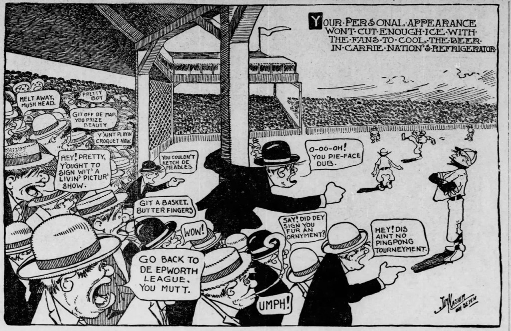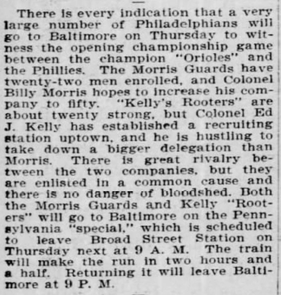 These two fan groups first appear in print in 1895, but I believe they predate these mentions. The newspaper reporting is rather matter-of-fact and gives the impression that these groups were a known commodity in 1895. Nevertheless, both groups were made up of impassioned Phillies fans. They gifted a watch to catcher Jack Clements and flowers to Sam Thompson before the 1895 home opener. In a column prior to the home opener, Inquirer sports writer Harry H. Diddlebock briefly described the Phillies’ new ballpark. The new ballpark would include seating under the main pavilion at field level. “An easy, comfortable chair has been placed in the stand, and the same kind of chair is placed under the stand where the Morris Guards and Kelly’s “Rooters” are expected to be heard, but not seen.” The groups also occasionally traveled with the club and made a strong showing on Opening Day 1895 in Baltimore.