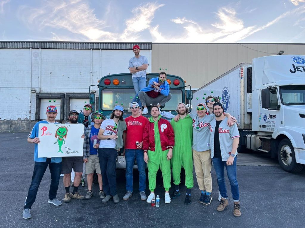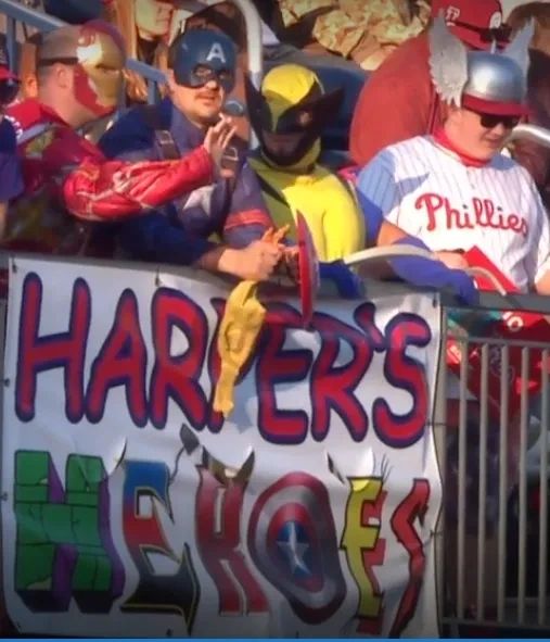 Randy Farrow, David Wardwell, Logan Yanucci and others dress up as superheroes as part of Harper’s Heroes. What makes this really interesting is that Farrow, Wardwell, and Yanucci were part of Howard’s Homers back in 2006. The group was interviewed by Philly Voice journalist Nick Tricome on Opening Day 2022.