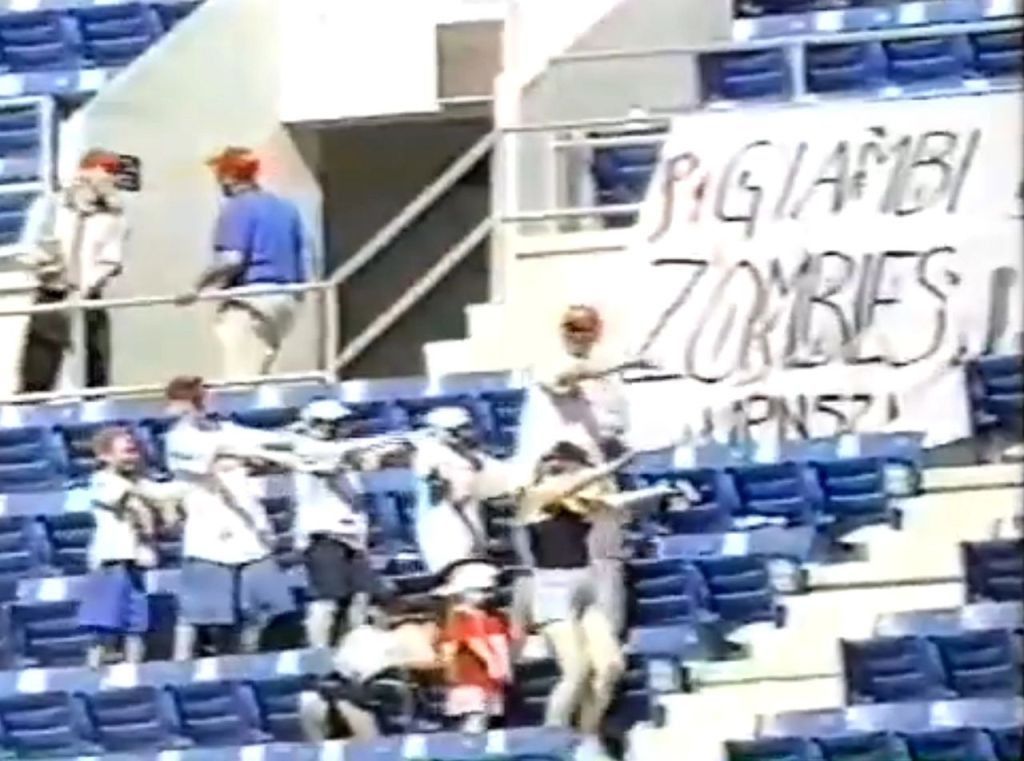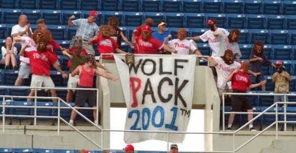 Randy Wolf debuted at the Vet against the Blue Jays on June 11, 1999 and pitched 5.2 innings and surrendered one run on six hits. (Roy Halladay pitched 1.1 innings in relief for Toronto that night, too.) Kevin and Randy Wood were playing a game of pool when they concocted the idea to that became the Wolf Pack. Evidently it was supposed to be a one-time thing but their other broths and a few other friends wanted in. They set up shop in Section 739 and howled and pumped their fists when Wolf struck out a batter. Their rules were no swearing, no drinking, and their wolf masks had to be worn at all times when Wolf was in the game. The group continued to balloon and was a sight to see during the Vet’s twilight years.